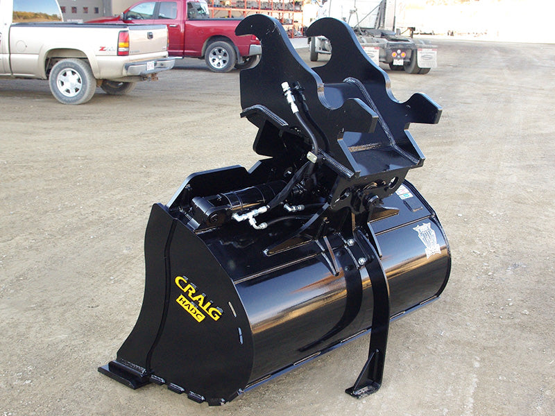 The Craig Hydraulic Angling Ditching Bucket has a flat cylinder design to keep the tip radius to a minimum. This design allows for a full 45° of rotation while guarding the cylinders for maximum protection.