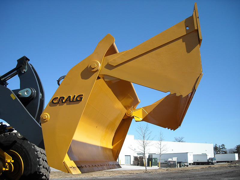 Multiply the productivity of your wheel loader with a Craig Multi-Purpose Bucket. Use it as a conventional bucket, a dozer blade, a clam grapple, a belly dump, a backfill scraper, or add pallet forks for material handling. Dual cylinders and heavy duty boxed frame construction ensure that it’s up for any task.